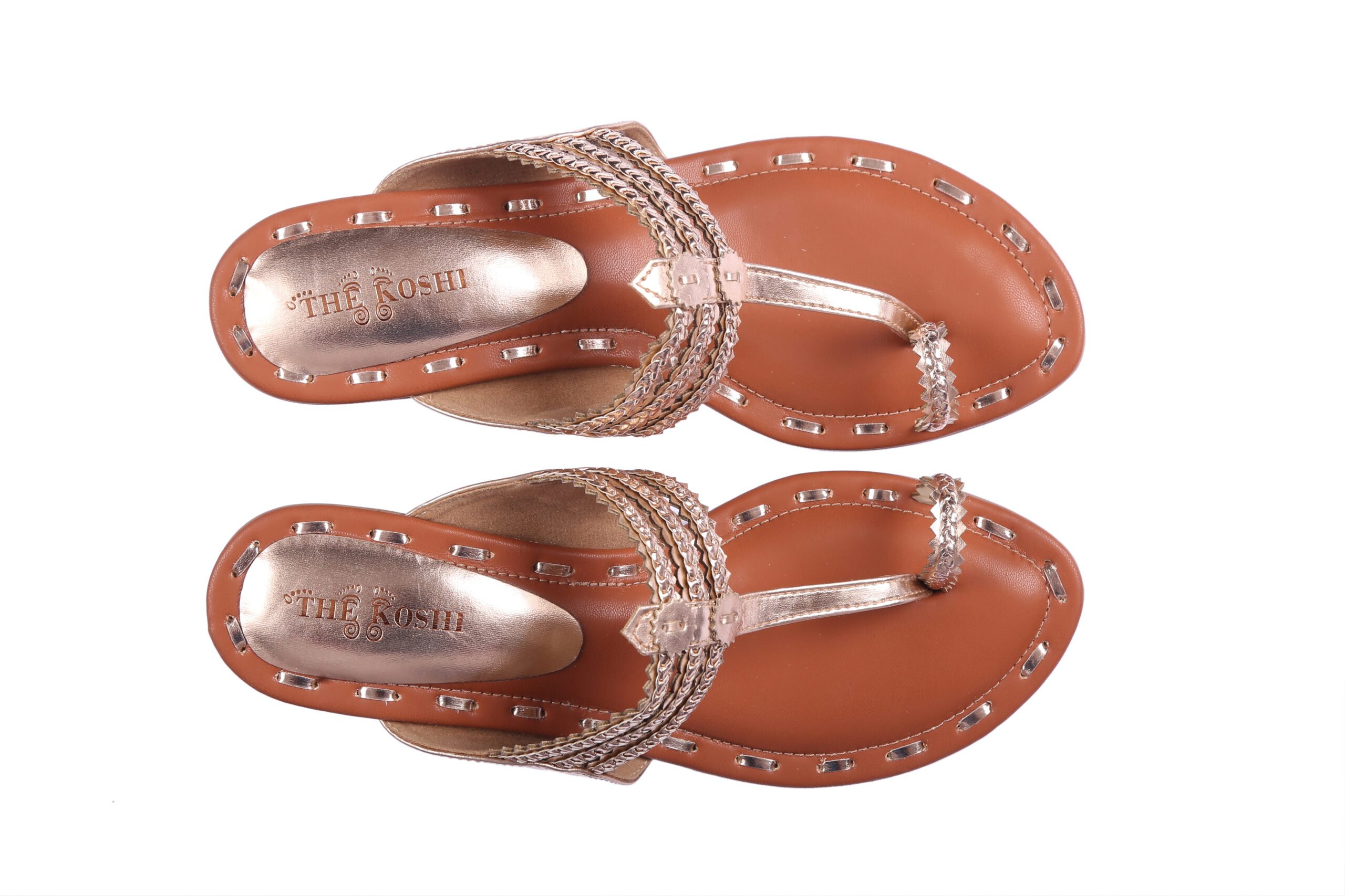 1. Handcrafted Rose Golden2 inch block heel Kolhapuris with intricate multi-strap detailing