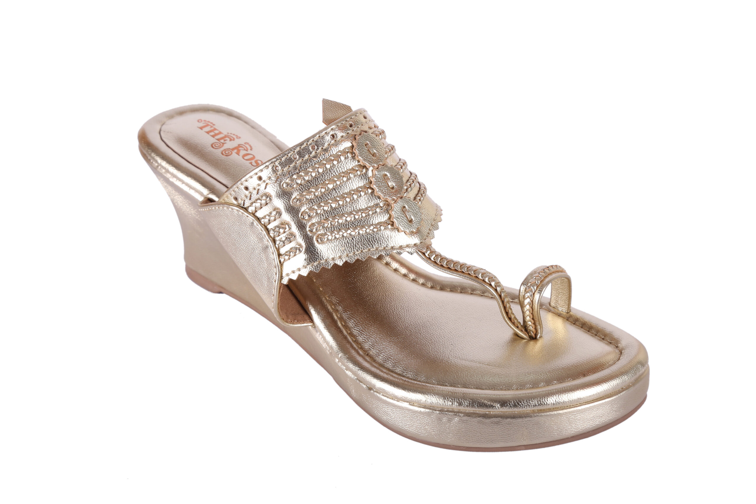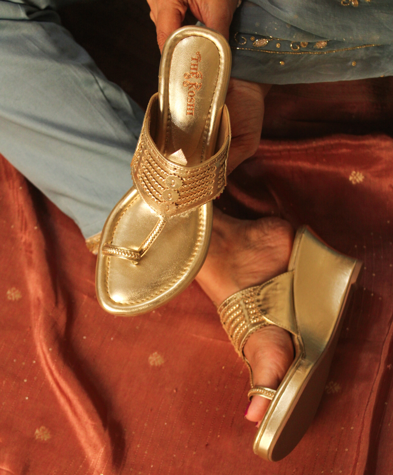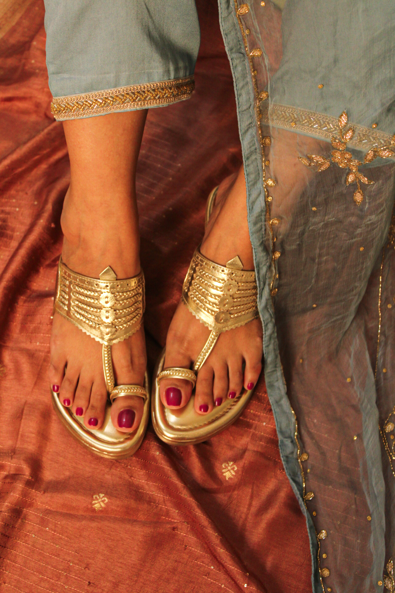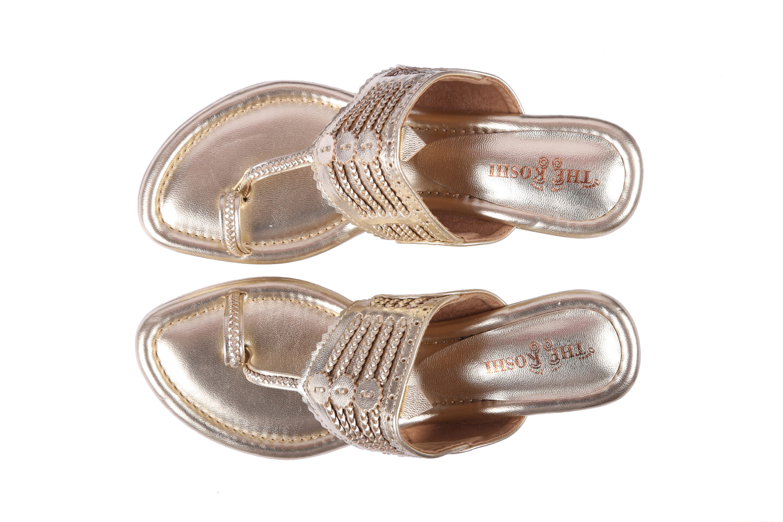 1. Handcrafted Golden Kolhapuris with intricate multi-strap detailing